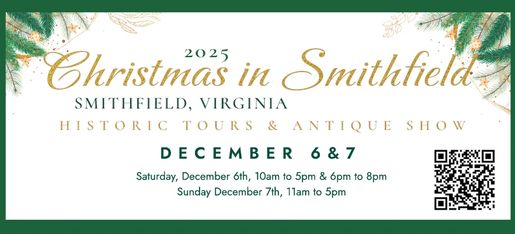Get ready for the magic of Christmas in Smithfield! Join us December 6th and 7th for tours of beautifully decorated historic homes and sites, like Mansion on Main, Chapman House, and the 1750 Isle of Wight Courthouse and much more. Plus, stop by the Antique Show packed with vintage treasures from high quality vendors from around the region.